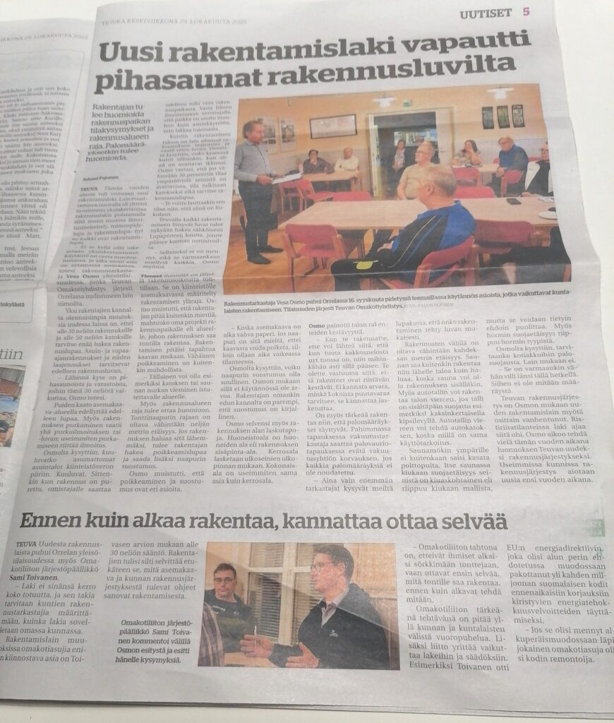 Aiheesta kertoi Omakotiliiton järjestöpäällikkö Sami Toivanen ja kunnan rakennustarkastaja/ kaavoittaja Vesa Osmo.